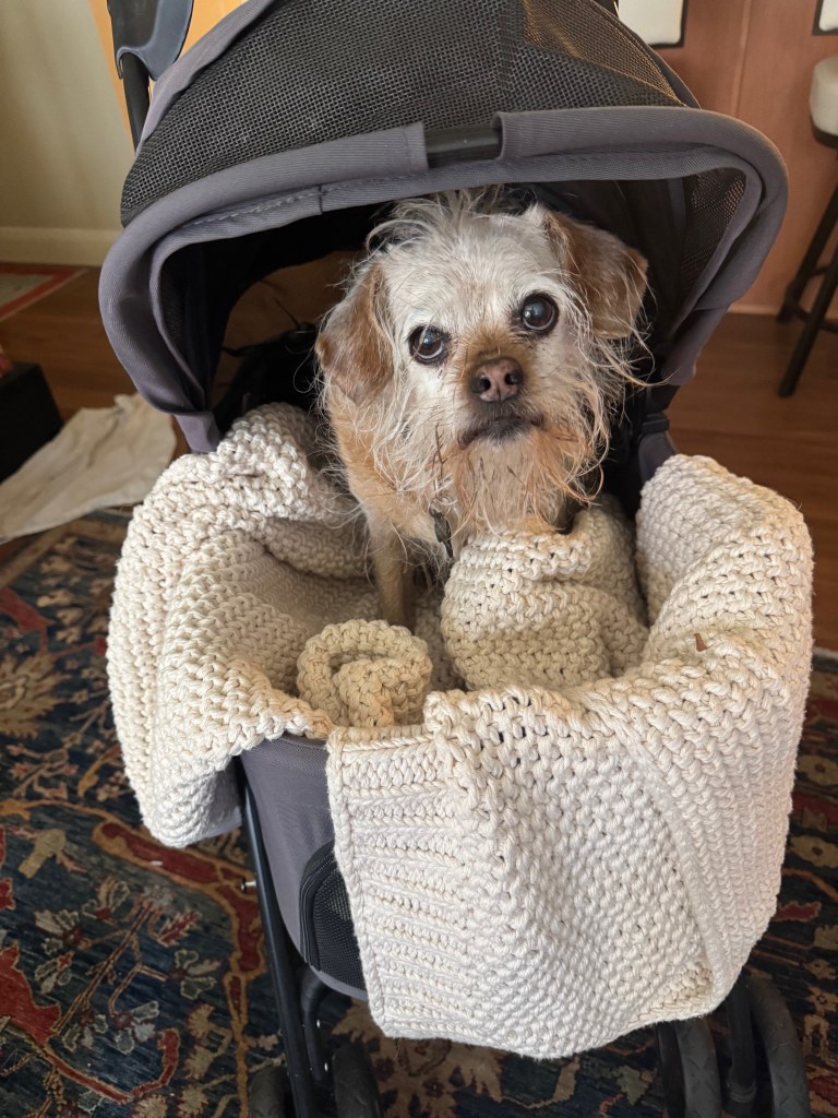 There are other accommodations necessary for the old dog. I bought a ramp that parallels my bed so she can come and go as she pleases. In our last home there were dog beds in every room. But, at the apartment, we’ve downsized and there is a dog bed in the living room just in case she doesn’t want to snuggle with me on the couch.